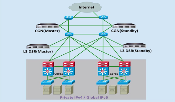 白河データセンターでは、今回CTCが導入したAXシリーズを用いたキャリアグレードNATとL3 DSR※4(Layer 3 Direct Server Return)を併用したシステム構成が採用されています。Yahoo! JAPANのサービスが稼働する共通IT基盤において、複数のサービスでIPアドレスを共有し、枯渇したIPv4アドレスを効率的に使用すると同時に、サーバへのアクセス負荷を分散するロードバランサの集約と異なるネットワークセグメント間での利用を実現します。