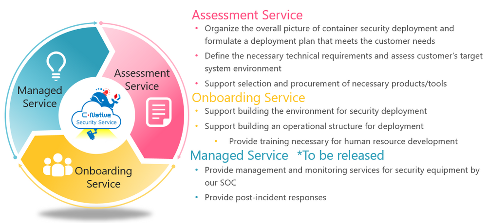 C-Native Security Service is a comprehensive service to support security measures for container-based applications, from deployment to operation, with the aim of enhancing security of the cloud-native environments. We will provide “Assessment Service” and “Onboarding Service” as the first two services.