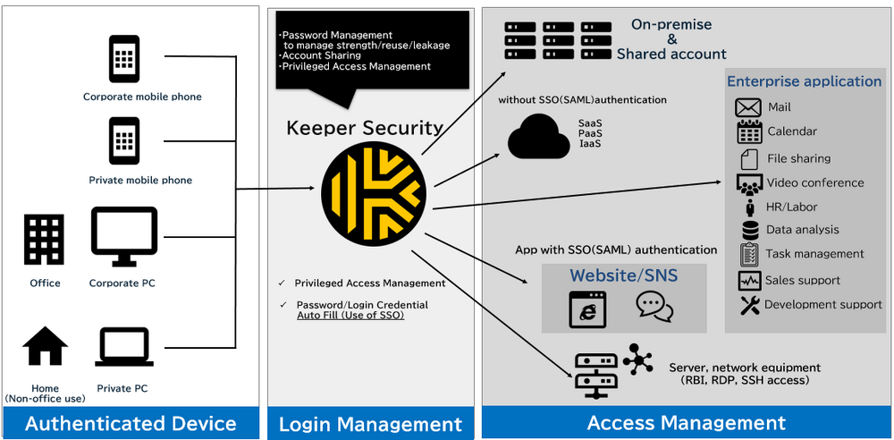 Keeper’s solutions are SaaS-based services designed to manage passwords and privileged accesses using zero-trust and zero-knowledge encryption models. The zero-knowledge encryption model is a security model that encrypts and decrypts user data at the device level, using a vault accessible only by the user to protect credentials such as passwords and certificates from threats. The service platform complies with multiple security certifications (*2) to safeguard corporate information under stringent security standards.