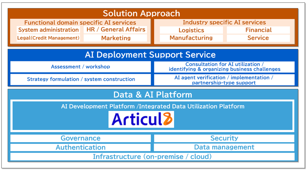 ITOCHU Techno-Solutions Corporation (headquartered in Minato-ku, Tokyo; Tatsushi Shingu, President and CEO; hereinafter CTC) has signed a value-added reseller agreement with Articul8 AI, Inc. (headquartered in California, USA; Arun Subramaniyan, Founder & CEO, hereinafter Articul8) for its autonomous generative AI relation platform. This marks the first such agreement with the company in Japan. CTC will position this platform at the core of our “Data & AI Offering Suite”—a suite of services supporting business transformation through the use of AI agents—to embark on full-scale launch of the services supporting company‑wide deployment of generative AI and its continuous utilization in business operations of our customers. We will provide comprehensive support from AI utilization strategy formulation to AI platform construction and operation enhancement, aiming to achieve ¥50 billion in revenue from advanced AI businesses, including generative AI, by the end of FY2026.