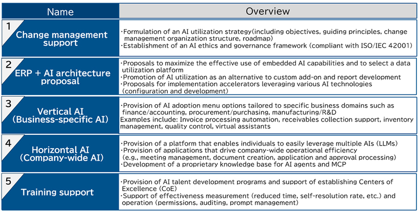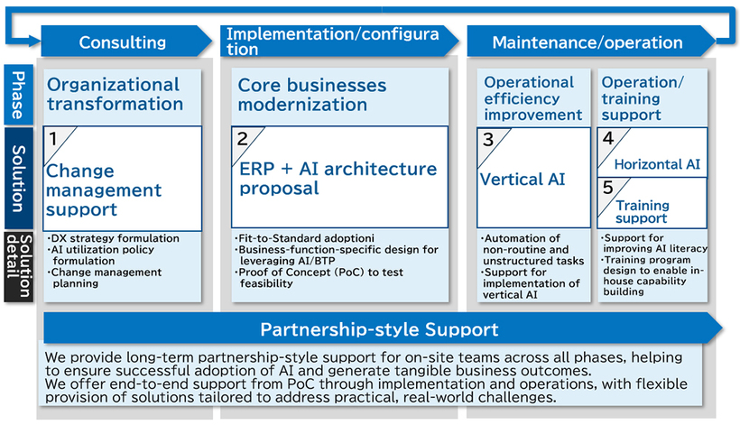 ITOCHU Techno-Solutions Corporation (headquartered in Minato-ku, Tokyo; Tatsushi Shingu, President and CEO; hereinafter CTC) will launch Figues Flex AI, our integrated solutions to support implementation and operation of SAP S/4HANA Cloud Public Edition, SAP’s ERP system. These solutions enable companies to formulate a strategic digital transformation (DX) policy centered on AI and accelerate their DX initiatives. CTC provides end-to-end support for the effective implementation and operation of the ERP by integrating AI across all phases: organizational transformation, core businesses modernization, operational efficiency improvement, and operation and training.