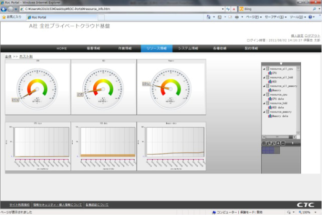 - プライベートクラウドインフラに最適設計されたユーザポータルが用意されており、お客様のシステムの利用状況や、状態を視覚的に分かりやすく把握できます。また、ウィザード形式で直観的に仮想マシンの作成や、リソースの再割り当てが可能なため、お客様は特別な知識が無くても容易にプライベートクラウドを利用できます。