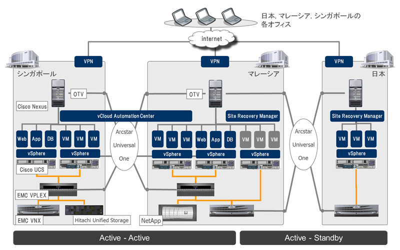 なお、本検証用データセンターについては、海外ではNTTコミュニケーションズのデータセンターであるサイバージャヤ3データセンター(マレーシア)とセラングーンデータセンター(シンガポール)を、日本ではCTCのデータセンターである横浜コンピュータセンター(YCC)を使用します。また、ネットワークについてはNTTコミュニケーションズのArcstar Universal One※1を使用します。サーバ、ストレージ、ネットワーク等のIT機器に異なるメーカーの製品を使用することで、マルチベンダー環境のシステム統合についても検証していきます。
