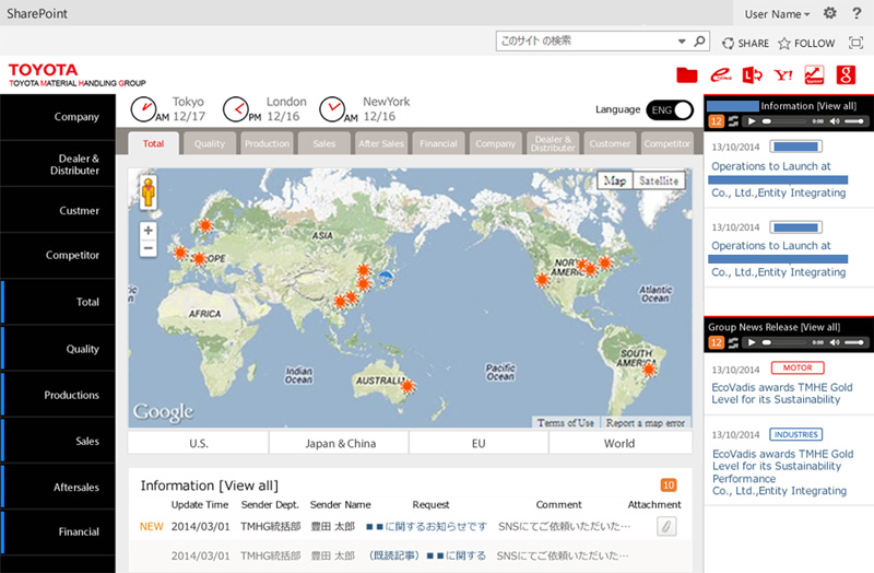 事業をグローバルに展開している豊田自動織機では、事業の拡大に伴い、海外を含めたグループ全体の経営情報を迅速に把握することで経営判断のスピード化を推進しています。 この度TMHGが導入した経営情報システムは、マイクロソフト社の「Microsoft SharePoint Server」を使用し、CTCが開発しました。入力項目の標準化により、担当レベルでシステムに出荷台数や売上高等の数値情報の入力ができるようになり、情報ポータルを通して経営情報を必要なタイミングで参照することが可能になりました。目標に対する国別の進捗を、月ごと、四半期ごと、年ごとに集計でき、進捗率が目標を上回っている場合は晴れ、下回っている場合は雨のマークで表示し、詳細な数字だけでなく直感的に確認ができます。