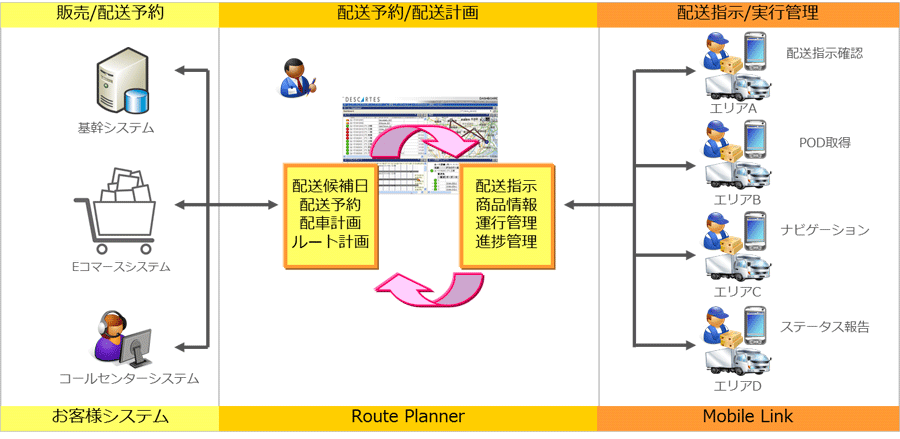 MAMSは注文時に配送計画を自動的に作成するクラウドサービスで、配送予定時間や配送状況等を自社のウェブサイトで追跡・確認することができます。受注と同時に、システムが効率的な配送ルートを自動で作成。配送担当者をはじめ関係者全員はPCやスマートフォンを使って情報共有が可能です。生鮮品や惣菜等が含まれた注文を優先的に配送するように設定できるため、スーパーの店頭での販売と同様に、出来たての商品を、ネットスーパーを利用するお客様にお届けすることができます。