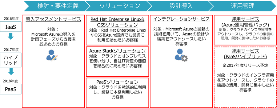 Red Hatが開発・提供する商用LinuxディストリビューションRed Hat Enterprise Linuxやオープンソースソフトウェアにも対応したサービス提供が可能です。今後は、Azure Stack※1を活用することで、Microsoft Azure上で利用するアプリケーションに最適なインフラを構築できる環境にも対応していく方針です。長年の実績を生かして、Microsoft Azureを活用したサービス開発を進めていきます。