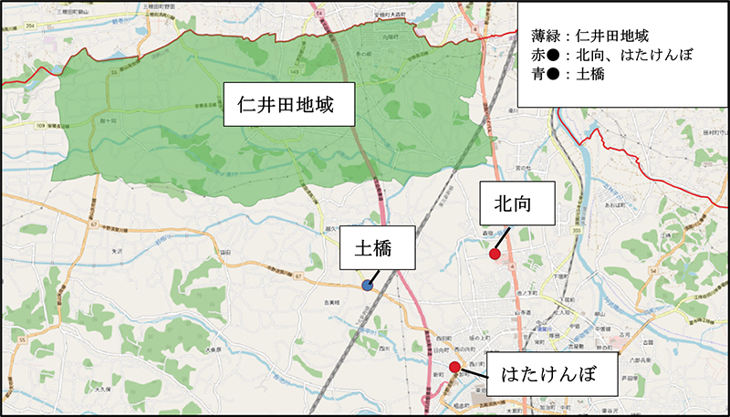 仁井田地域の一部(仁井田、舘ヶ岡、季の郷、向陽町) ※特定乗降場所(土橋・北向・はたけんぼバス停付近) |