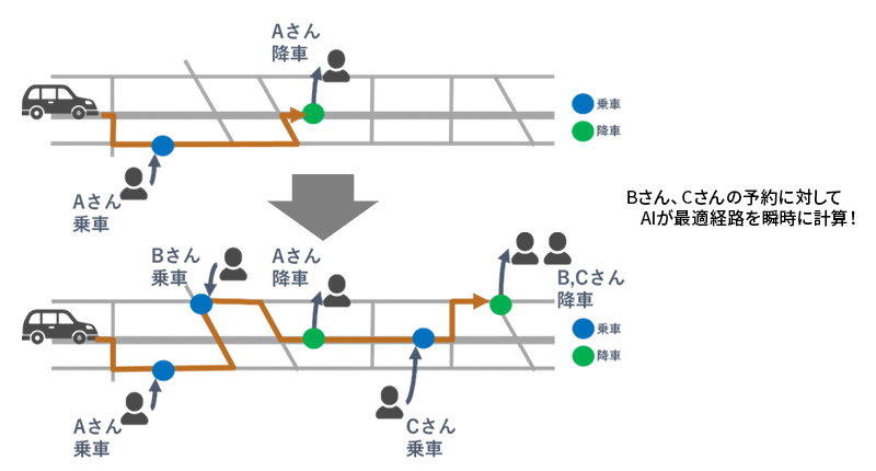 アプリ・電話を通じた利用者からの予約状況に応じて、AIが最適経路を随時更新しながら運行します。