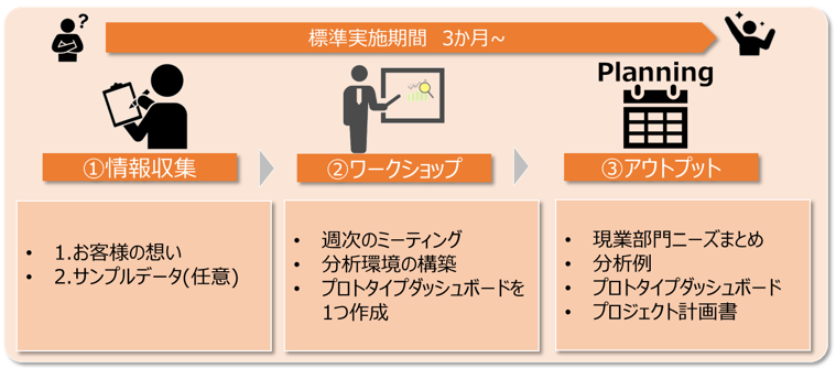 ビジネス・システムの両面からの課題や取り組みのヒアリングにはじまり、仮説に基づくデータの収集・蓄積を経て、まずは仮説に関わるデータを可視化したダッシュボードを作成します。作成したダッシュボードをベースに、グラフや指標の追加・変更を含めてお客様と議論し、効果が見込める状況になるまでブラッシュアップを繰り返します。 情報の可視化によって業務状況の更なる理解にもつながり、改善や最適化、新規ビジネスの創出などに取り組むことができます。