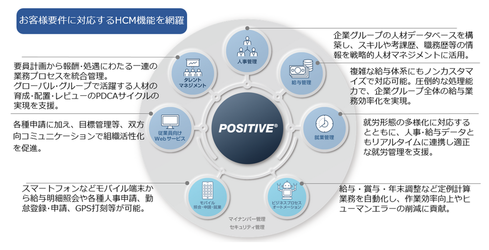 POSITIVEは、人事・給与・就業管理に加えて、タレントマネジメント支援やグループ会社管理など、広範な業務機能を網羅した統合人事システムです。従業員は、担当している職務または将来目指す職務に必要な「知識、技能・技術、経験」に対して、本人が修得しているスキルを入力することで、現有能力の確認(レベル判定)と、将来行いたい職務に対する不足能力の確認(ギャップ分析)を実施することができます。また利用企業は、従業員の入力データに基づき、能力開発や適材適所な配置を図ることができ、業務の生産性や成果の向上を通した人的資本の強化につなげることができます。データの管理や分析に際しては、企業固有の管理項目を自由に追加することができ、また、グループ各社で資格や役職の定義が異なる場合でも、全社統一基準に読み替えて情報の抽出・分析を行うことができるため、グローバル・グループで活躍する人材の育成・配置にも活用が可能です。