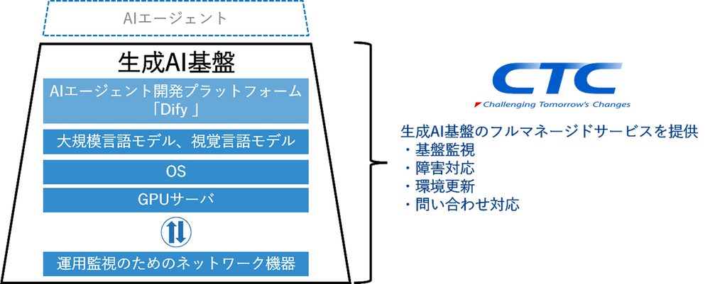 CTCは、大規模なインフラ構築の実績と、多様な業種でのAIモデルの設計や活用に関する経験を活かして、GPUの最適化やオンプレミス環境の設計、構築、基盤の監視や障害対応、ソフトウェアやAIモデルの定期更新も担います。