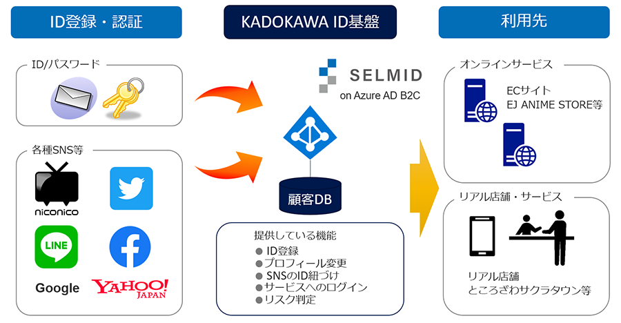 株式会社KADOKAWA Connectedは、KADOKAWAグループ全体のデジタルトランスフォーメーション(DX)を加速させ、業界最高水準のICTサービスを社内外に提供する役割を担う。1期目に課されたミッションは「KADOKAWAグループサービスの共通ID基盤」の実現。サービス展開が半年先に予定されており、開発の時間的制約は厳しかった。そこで採用したのが伊藤忠テクノソリューションズ株式会社(以下CTC)のBtoC向けID基盤サービス「SELMID(セルミッド)」だ。海外在住のファン向けに日本のアニメ、コミック、ライトノベル、ゲーム等の公式グッズを販売する越境ECサイトとの連携から始まり、今後も続々と他サービスへ展開する予定だ。