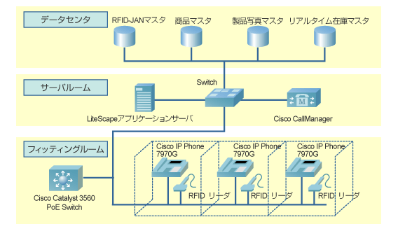 試着室にアプリケーションを搭載したIPフォンとICタグリーダーを設置。PoEスイッチを経由してサーバに接続し、さらにデータセンターの商品マスタや在庫マスタなどのシステムと接続。試着室から在庫情報をリアルタイムに呼び出し、IPフォンの液晶ディスプレイに表示する仕組みだ。短い準備期間であったため、電話機能を組み込むことはできなかったが、IPフォンを情報端末として活用する、日本で初めての試みであった。