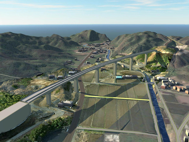 SMC-Modelerは、モデル現場として岩手県久慈市の国道45号夏井高架橋で利用しています。ここではドローン撮影画像から作成した地形の3次元モデルと高架橋の3次元モデルを重ね合わせて、完成形のイメージとして周辺住民の方々や施主に見て頂き、合意形成の一助としました。逆に言えば、近くの誰かのお宅から橋がどういう風に見えますかと言われたらそれが表示できるわけで、その表示までの時間がぐっと短くなっています。今までやりたくてもハードルが高かったことが、より簡単に実行できるようになりました。
