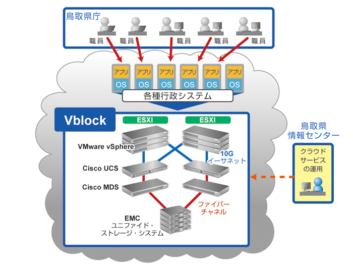 ここにおいて多くの自治体から注目を集めているのが、鳥取県情報センターが構築したクラウドシステムだ。2010年10月から新システムで鳥取県庁や県内自治体の行政サービスのクラウド化を開始。2011年5月現在、11台の物理サーバで86台の仮想マシンを稼働させている。今後もサーバを集約していくことで、電力消費を90%以上削減できると試算されている。更に、仮想化統合インフラ「Vblock(ヴイブロック)」で構築することにより、セットアップからサービスインまでわずか10日間で実現している。