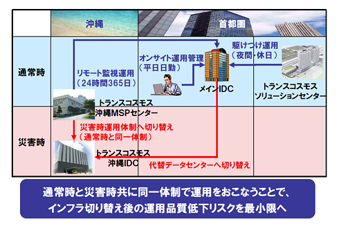沖縄IDCと沖縄MSPセンターによる「マネージドIDCサービス」は、バックアップセンターとして遠隔地からのデータリカバリーにも対応できるし、代替センターとしても機能する。もちろん、メインセンターとして活用することも可能だ。従来型の災害対策とは異なり、トランスコスモスならではの高品質なシステム運用のノウハウも最大限に活用できる。「遠隔地にあるIDCとして、多彩なニーズに対応できます。運用監視も、複数のお客様の共同利用となるリーズナブルなシェアード型からミッションクリティカルな専任体制も可能です」と、藤原氏は強調する。