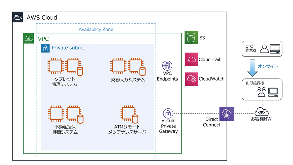 「当行のプライベートクラウドはインターネットに接続できないため、一般的なインターネット経由の移行ツールを使うことができません。そこでどのような移行方法が最適なのかCTCに教示してもらい、最終的に当行の閉域網とAWSクラウドをAWS Direct Connectで接続し、Amazon S3(Simple Storage Service)のストレージを経由させ移行するという手段をとりました」(髙橋氏)