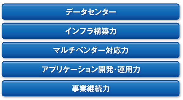 「データセンター、インフラ構築力、マルチベンダー対応力、アプリケーション開発・運用力、事業継続力の5つです。パートナーがこれらの能力を備えているかどうかが、ユーザー企業にとって重要な判断材料になると当社では考えています。そして、SI業界のリーディングカンパニーを自負するCTCは、クラウドに必要な技術と要素をすべて備えています」