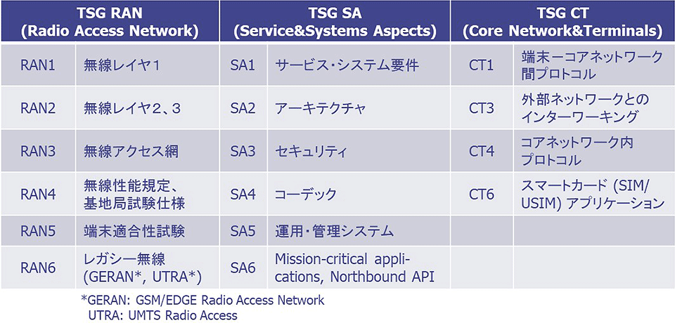 3GPPでの仕様検討は、TSG (Technical Specification Group)とその配下のWGで行われています。その構成について解説すると、現在、TSGは分野別にRAN (Radio Access Network), SA (Service & Systems Aspects), CT (Core Network & Terminals)の3つに分かれています。TSG RANでは無線と無線アクセス網の仕様策定、TSG SAではシステム全体の要件やアーキテクチャに関する仕様策定、TSG CTでは主にコアネットワーク内と端末、外部ネットワークとの間で使われるプロトコルの策定を行っています。「策定」と書きましたが、実際の「検討」は各TSG配下にあるいくつかのWGで更に細分化された分野ごとに仕様の検討が行われ、TSG会合は各WGで合意された仕様を承認する場になっています。これが「(3GPP)プレナリー」と呼ばれる会合で、年に4回(3月、6月、9月、12月)、3つのTSGが集まって開催されます。に仕様策定が完了した「5G標準仕様」は、6月に開催されたプレナリー会合で承認されたものです。