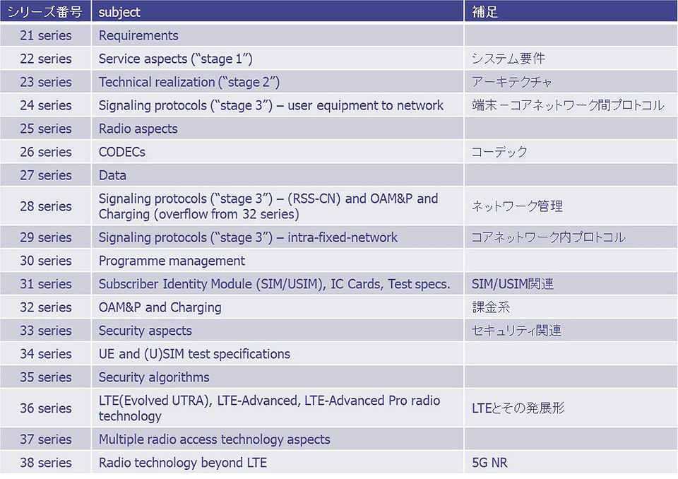 3GPPで作成されるドキュメントは、分野ごとにシリーズ番号が割り振られています。そのため、シリーズ番号を見ると、例えば、それが要件を定義した文書なのか、アーキテクチャを規定した文書なのか、プロトコルの詳細について記述した文書なのかが分かります。3G以降について規定したドキュメントでは、以下のシリーズ番号が使われています。
