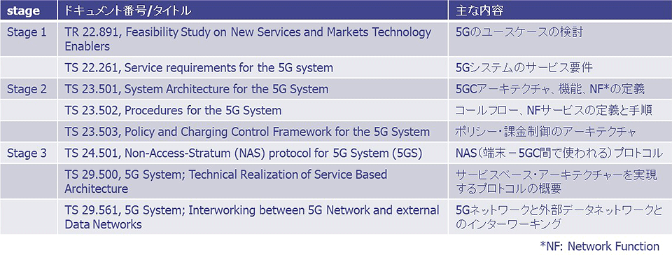 SA2ではこれを基に5Gコアネットワーク (5GC)のアーキテクチャの検討が行われ、5GCアーキテクチャ、コールフロー、ポリシー・課金制御アーキテクチャの3つの仕様が作られました。更に、CTの各WGでは5GCで使うプロトコルの検討を行いました。これらを表にまとめると以下のようになります(ステージ3のドキュメントは非常にたくさんあるので、CT1/3/4作成のドキュメントから1件ずつ抜き出しています)。