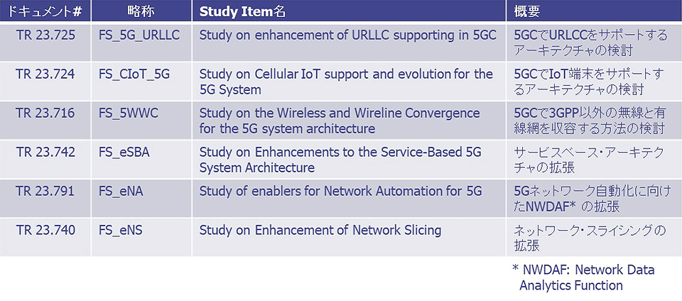 先ほどの表からも分かるように、SA2ではリリース15の検討がに終わり、現在はリリース16に向けた新たな機能の検討をStudy Item(新たな機能に関する仕様を策定する前に、課題とその解決案について検討を行うフェーズ)として行っています。Study Itemはいくつもあるので、その中から5G phase2向けの追加機能と、リリース15で5GCに新たに導入された機能をさらに拡張する技術を以下にご紹介しておきます。
