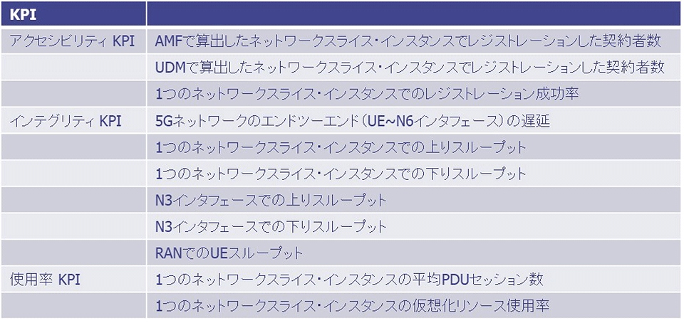 アクセシビリティKPIは、あるネットワーク・スライスでレジストレーションした契約者数とその成功率を計測します。インテグリティKPIは、ネットワーク(・スライス)の遅延やスループットを計測します。使用率KPIは、あるネットワーク・スライスでのセッション数や仮想化リソースの使用率を計測します。