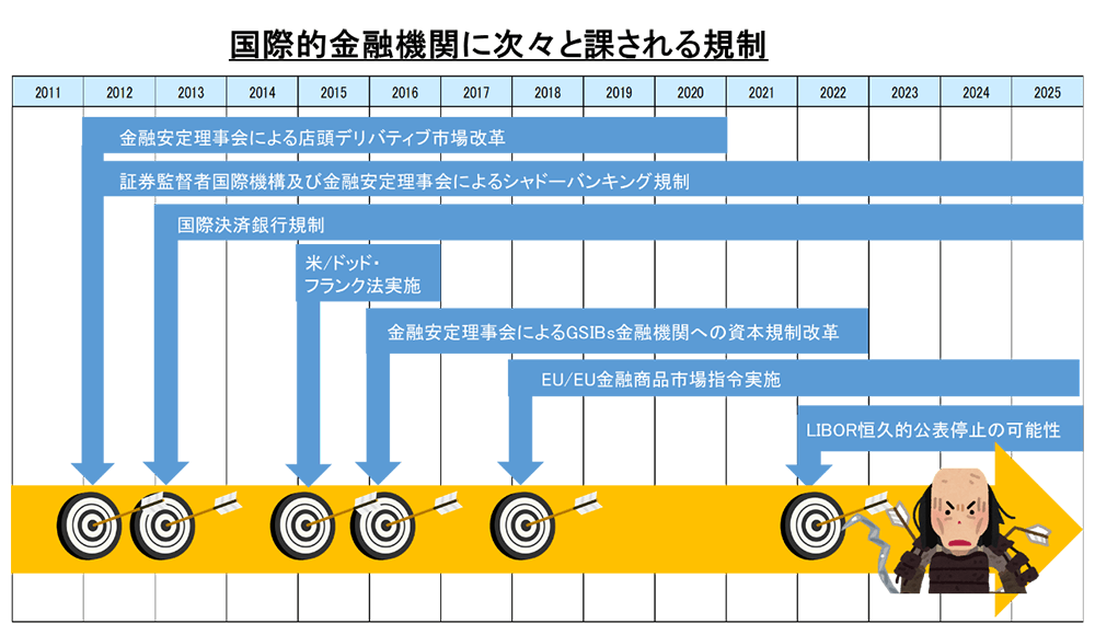 各種の金融派生商品は金融機関同士の相対での取引(店頭取引=OTC取引)が中心で、株式の証券取引所のような取引が集中して行われる機関がありませんでした。相対での取引には透明性がなく、各金融機関がどの程度のリスクを負っており、仮に破綻した場合、どこまで影響が及ぶのかわからない状況となっていました。リーマンショックの発生を通じて、各国中央銀行、監督官庁(併せて金融当局)、金融機関自体も影響を把握出来ないという、根本的な金融システムの脆弱性が露呈してしまいます。これ以降、金融機関の市場業務に対しては透明性とリアルタイム性を目的とした各国金融当局の法規制の改定や追加が年々厳しく課せられるようになりました。