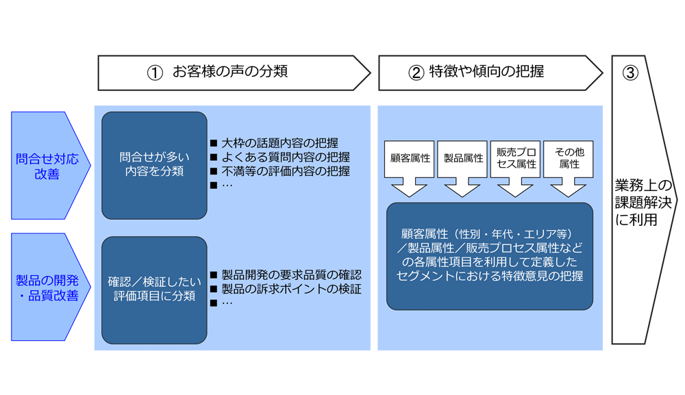 この例では、問い合わせ対応改善の目的に対して「問い合わせが多い内容を分類」しています。製品(サービス)の開発・品質改善の目的に対しては「確認/検証したい評価項目に分類」しています。分類後には、データに付随する各種属性の情報を利用して特徴的な意見や傾向を把握しています。分析の実務の現場では、このようなアプローチが有効となります。