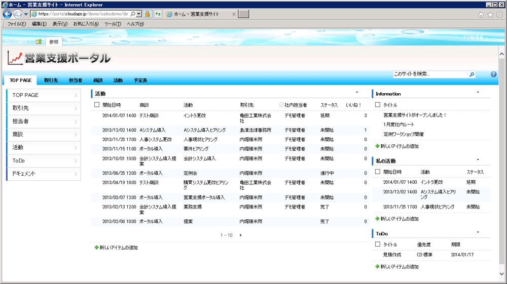 この営業活動の見える化を支援するサイトをCTCの情報システム部が運用しているMicrosoft SharePoint※1(以下:SharePoint)の基盤上に構築しました。このサイトには機密性の高い情報が含まれていますが、全社の統合基盤上で運用することでキュリティ対策や運用負荷の軽減を図っています。また、SharePointは業務に合わせた簡易データベースを作成することができます。