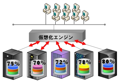 コンピューティング・システムにおける仮想化とは、リソースの抽象化を意味しています。つまり、コンピューティング・リソースの物理構造を利用する側から隠蔽して、より使いやすい形態で提供することです。複数のものをひとつに見せたり、逆にひとつのものを分割して複数に見せたりすることで利便性を高めることを目的としています。具体的な例としては、RAIDの技術は複数のHDDをサーバからはひとつのHDDに見せていますし、VMwareのようなミドルウェアはOSとH/Wを分離するだけでなく、単一のサーバを複数のサーバに論理分割することが可能です。