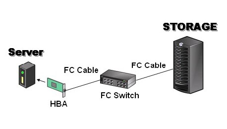 HBA - サーバにはFCケーブルのためのポートが準備されていないので、FCポートを有するHBAをサーバのスロットに挿入する必要があります。HBAにはドライバが付属されており、OSのSCSIドライバと連携することにより、HBAはサーバからはSCSIボードとして認識されるようになります。FCのプロトコル制御は全てHBA上で行われるために、サーバのCPUに負荷をかけることなく高速転送を実現します。