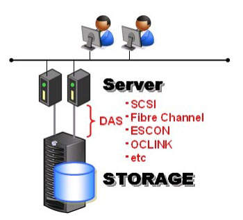 DASは名前の通りに、サーバとストレージがケーブルにより直接結線されている方式のことです。DASという言葉からは従来のSCSI接続をイメージする人が多いようですが、実際にはメインフレームのESCON,OCLINKやファイバチャネルを使った結線でも、サーバとストレージが直接接続されている場合には全てDAS接続に相当します。