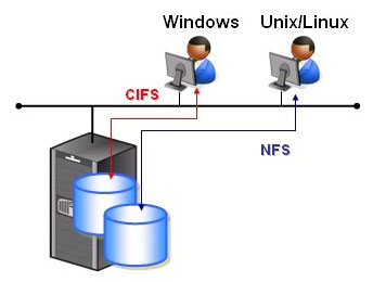 NASがネットワーク上に共有させるドライブはWindowsからはCIFSを介してネットワークドライブとして認識され、UNIX/LinuxからはNFSを介してサブディレクトリとして認識されます。NFSもCIFSも仮想ファイルシステムのプロトコルなので、クライアントからのアクセスは全てファイル単位でのアクセスになるのが特徴です。
