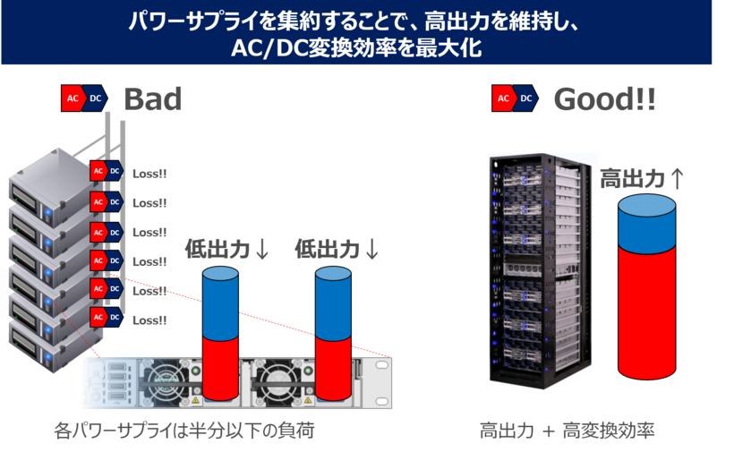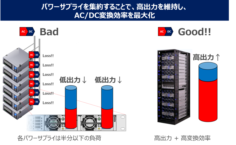 それに対し、OCPのOpenRackに搭載されている集中電源ではサーバーが個々に持つパワーサプライをラックレベルで集約するため、高出力状態になり高い変換効率が得られます。変換効率が高いことは消費電力を減らせるだけでなく、発熱を抑え、冷却に必要なパワーや騒音を減らし、パワーサプライの負荷も軽減できるメリットがあります。