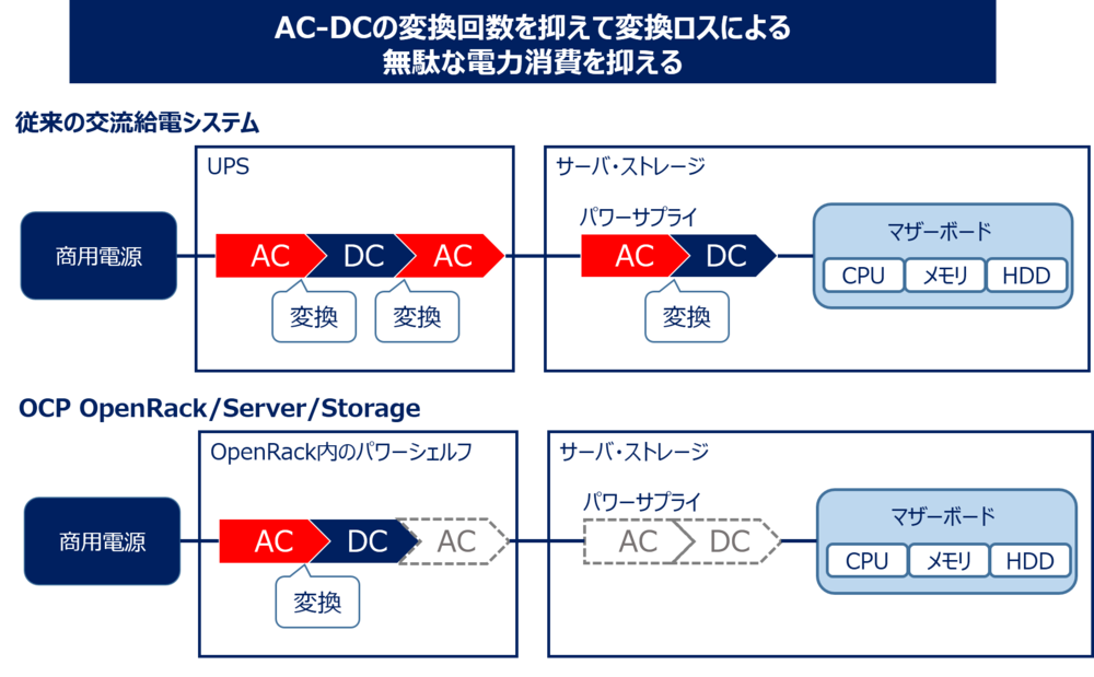 交流(AC)と直流(DC)の変換には、一般に10%~20%程度のロスが発生すると言われています。OCPのOpenRackではラック内の集中電源において交流(AC)→直流(DC)へ変換し、ラック背面にあるDCバスバーを介してサーバーに直流給電する方法を採用しています。