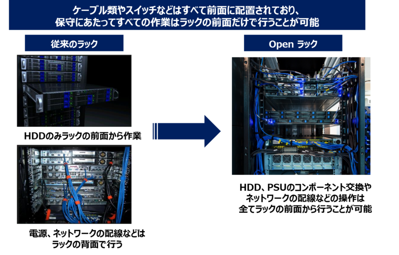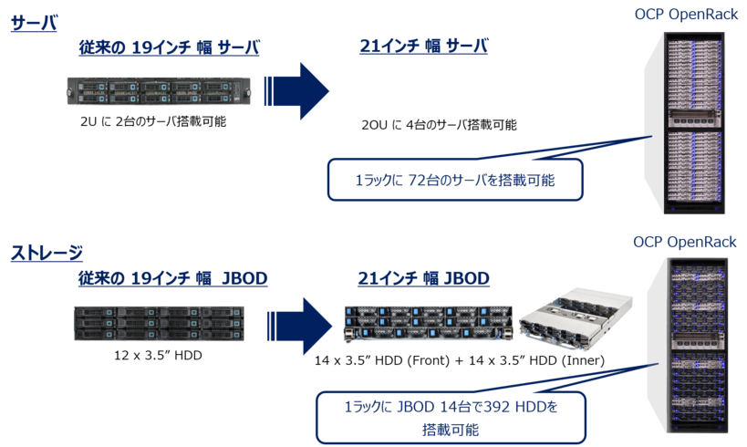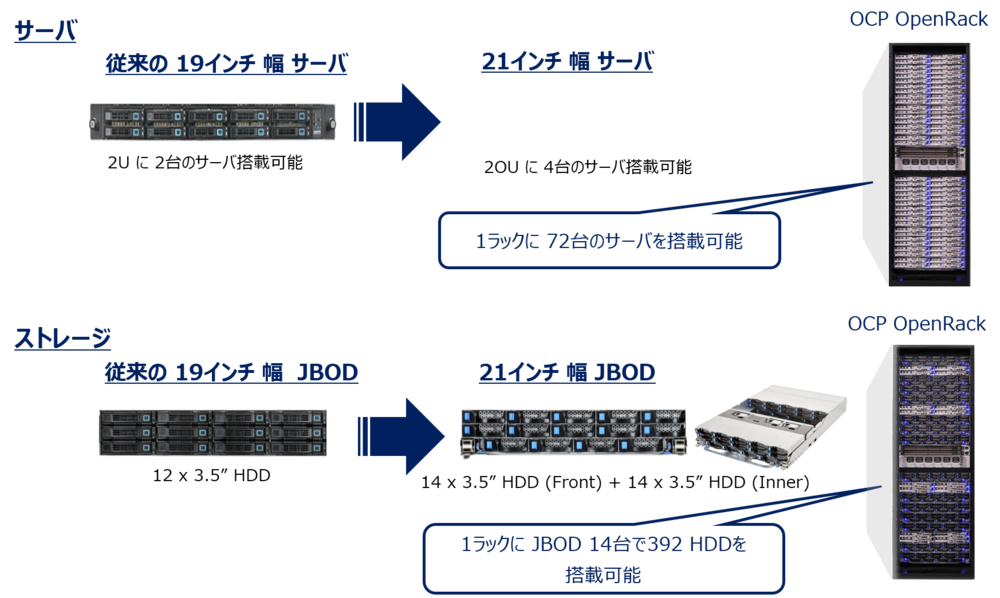 OCPのサーバー、ストレージは省スペース設計であり、ラック内に搭載できるサーバー、ストレージの台数を高めることが可能です。