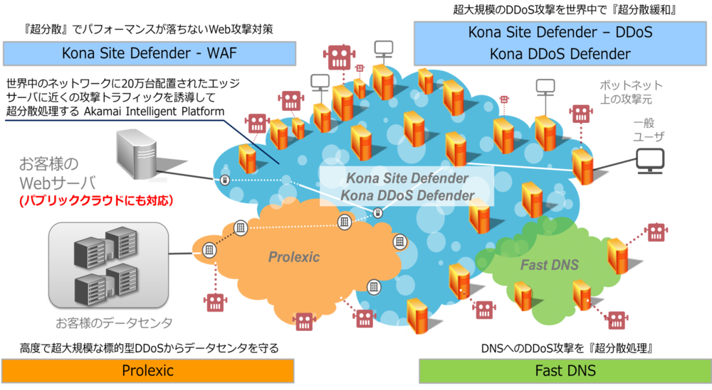 アカマイは、世界中のネットワーク内に20万台以上の『エッジサーバ』を配置した超分散型プラットフォームによって、次のセキュリティ機能を提供します。