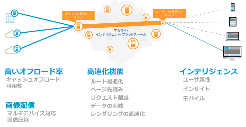 全世界に展開する20万台以上のサーバ群によって構成されるアカマイ独自のネットワーク、「Akamai Intelligent Platform」を通じて、企業がインターネット上でビジネスを行うために必要な安全性と高いパフォーマンスを提供します。