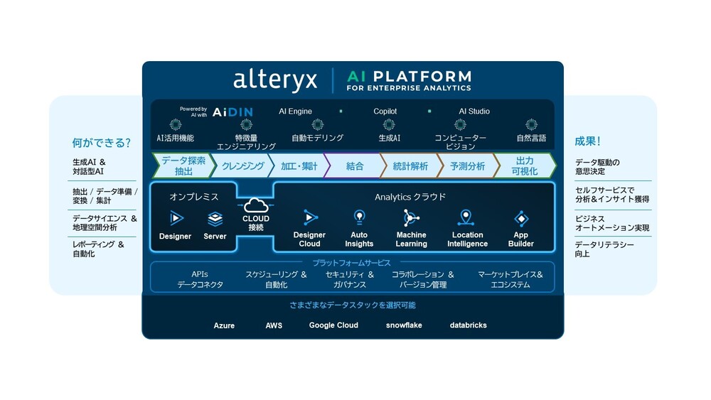Alteryxは、データの準備、統合、分析をノンコードで一貫して行えるプラットフォームです。80以上のデータソースと連携して、プログラミングの知識がなくてもGUI操作で直感的にデータ加工や分析を行うことが可能です。