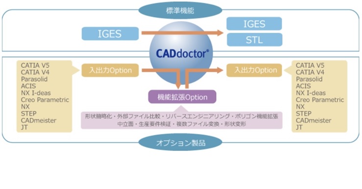 CADdoctorは、標準パッケージと追加オプションで構成されます。標準パッケージ(IGES入出力・STL出力)に入出力オプションを追加することにより、高精度のデータ変換や用途に応じた効果的なデータ活用が可能になりましす。また、「形状簡略化オプション」をはじめ、データの利用目的に応じて形状を最適化するための様々な機能拡張オプションをご用意しています。