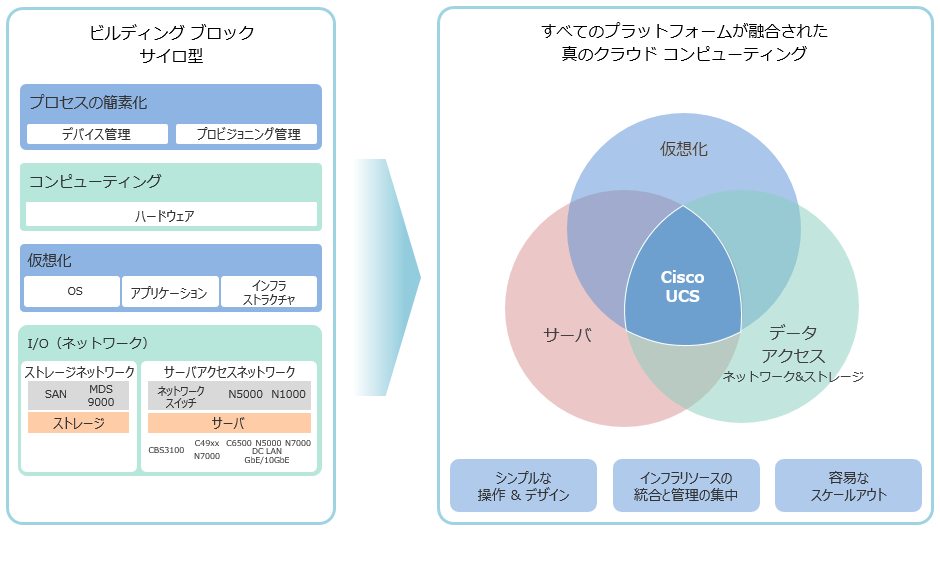 UCSは、サーバ、ストレージ、ネットワークの全ての仮想化を統合し、集中管理を可能にした、今までのブレードサーバの問題点を解決する新しいプラットフォームです。