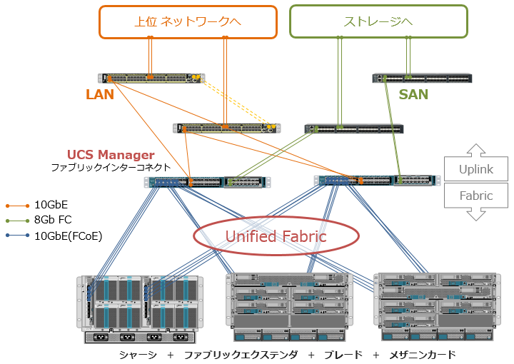 FCoEを採用することにより、本来異なるプロトコル、ケーブル、スイッチを必要とするLAN(Ethernet)とSAN(FC)を、UCSでは一つのネットワーク(「Unified Fabric」)に統合。今まで、Ethernetで必要であったNICと、FCで必要であったHBAを統合し、コンポーネント(拡張カード、ポート、ケーブル)の数量を削減します。