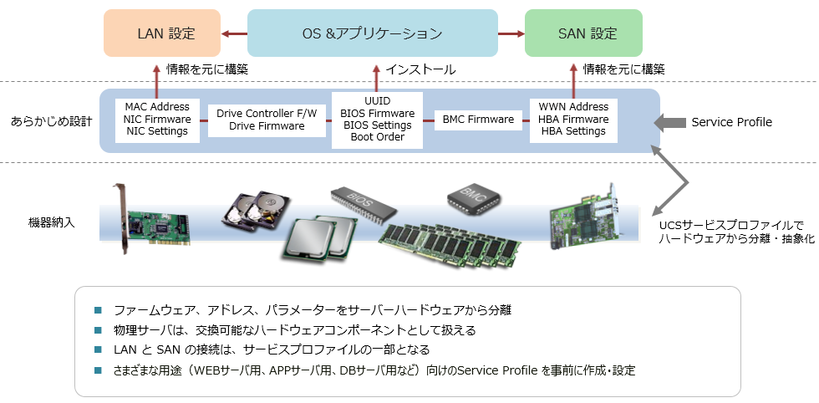ID情報と動作属性情報を持たないハードウェアは、サービスプロファイルと結びつけることによって、初めて、これらを獲得し、サーバとして機能することができるようになります。