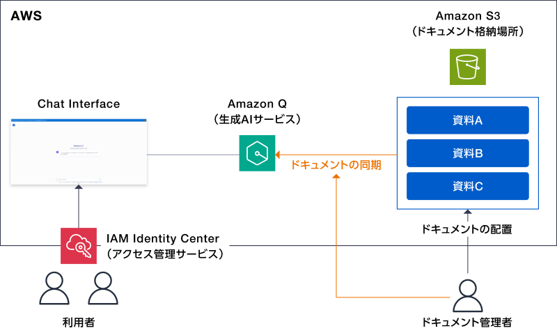 ⽣成AIサービスに学習させたいドキュメントをAmazon S3にアップロードいただき、AWSフルマネージドサービスの⽣成AIサービスであるAmazon Qへ同期(学習)を⾏うことで、チャット形式で⽣成AIサービスをご利⽤いただきます。