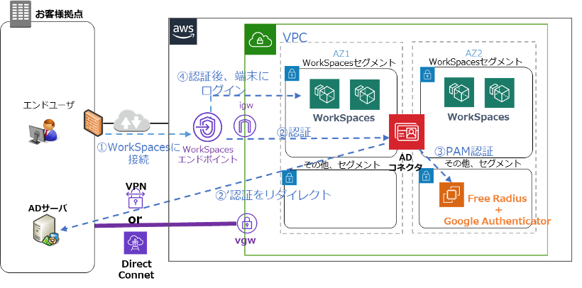 1.ユーザがインターネット経由でWorkSpacesのエンドポイントにアクセス