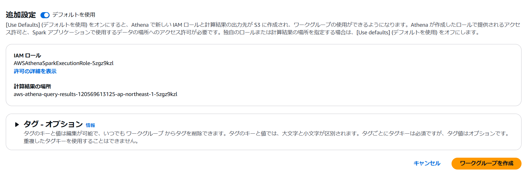 追加設定でデフォルトを使用をオンにします。 デフォルト設定とした場合、IAMロール及びS3バケットが作成されます。 (IAMロールおよびクエリ結果の出力先を指定したい場合は、個別に設定をします)