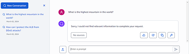 セキュリティ系のドキュメントを読み込ませているので、「ALBをDDoS攻撃から守るためにはどうしたらいいか?」と英語で入力すると以下の様にそれっぽい回答が出力されました。