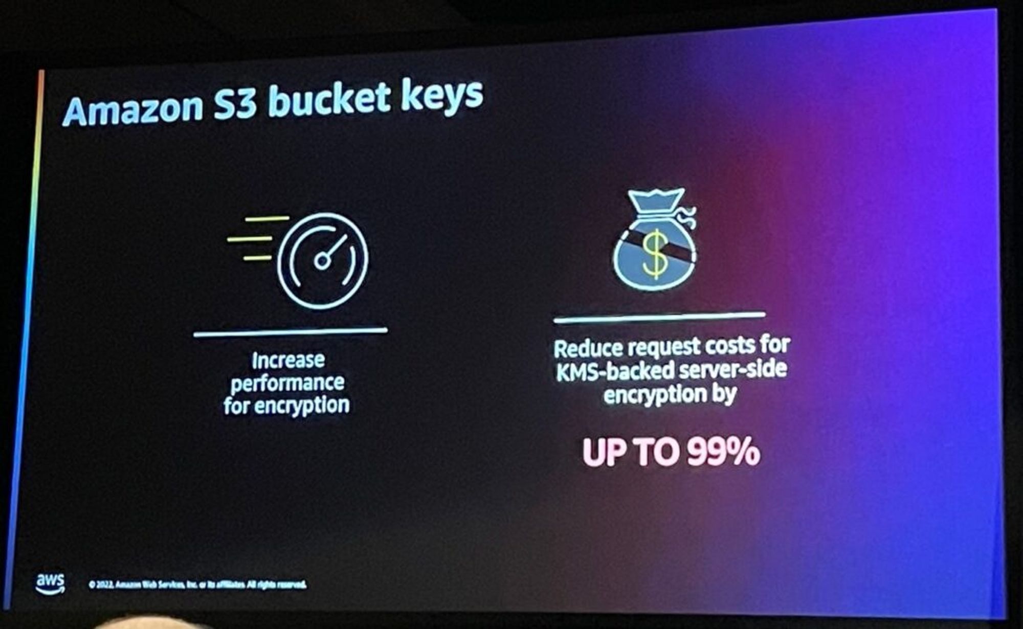 Amazon S3バケットキーを使用すると、暗号化のパフォーマンスが向上し、KMSを使用して暗号化する場合よりも最大99%のコストを削減できます。