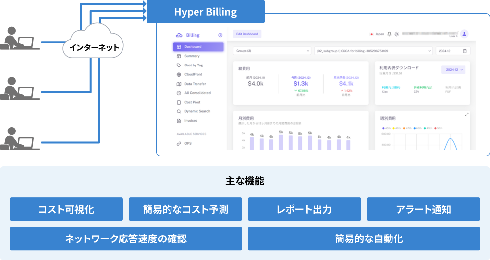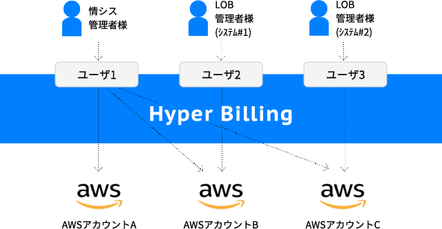 Hyper Billing は、Web ブラウザ経由で視覚的に AWS 利用料を随時参照可能な AWS コスト可視化ツールです。情報システム部門、ビジネス部門のユーザ役割に応じて、閲覧できるコスト情報を AWS アカウント単位で制御可能です。